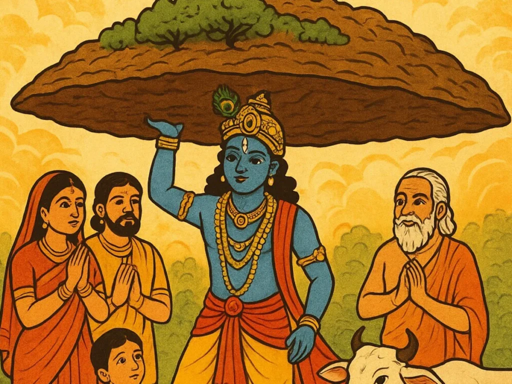 विष्णु पुराण के अनुसार, इंद्रदेव अपनी शक्ति पर अभिमानी हो गए थे। गोकुल में लोग इंद्रदेव की पूजा कर रहे थे, लेकिन बाल कृष्ण ने कहा कि हमारी गायों और गोवर्धन पर्वत की पूजा करनी चाहिए। इंद्रदेव ने क्रोधित होकर बारिश भेजी, लेकिन कृष्ण ने गोवर्धन पर्वत अपनी उंगली पर उठा लिया और गांववालों को सुरक्षित रखा। इंद्रदेव ने अंत में भगवान कृष्ण से क्षमा मांगी। तभी से गोवर्धन पूजा मनाई जाती है।